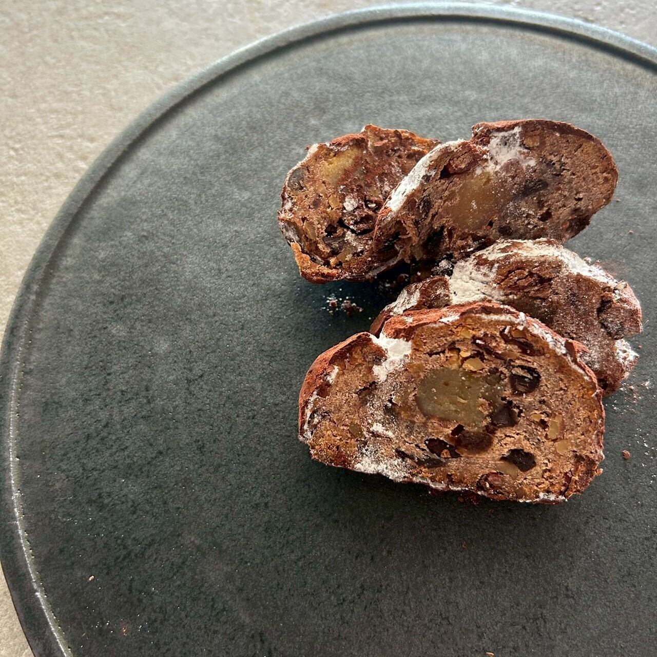 生地にカカオパウダーを練りこみ、チョコチップを入れたWチョコレートシュトーレンです。ラムレーズンとクランベリーを2か月以上ラム酒に漬け込み、アーモンドをたっぷり入れて丁寧に焼き上げました。ワインにぴったりな芳醇なシュトーレンに仕上がりました。